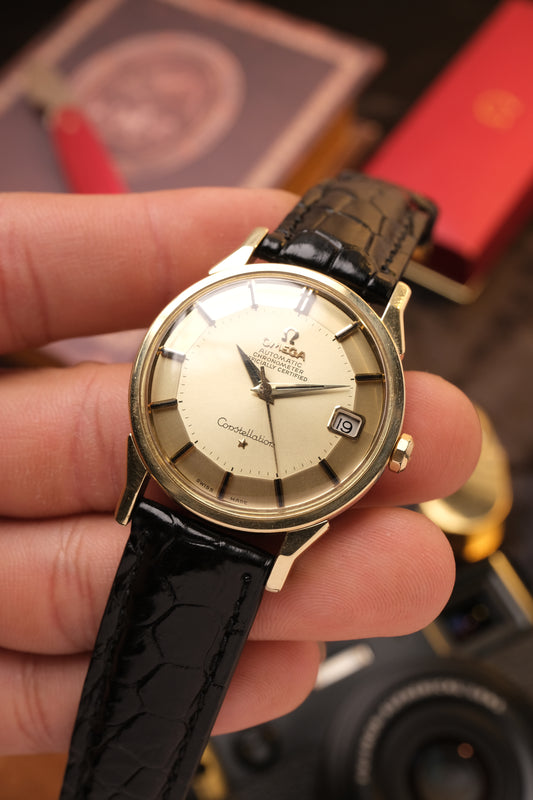 OMEGA CONSTELLATION PIE PAN DOG LEG GOLD AUTOMATIC CHRONOMETER REF. 168.005 Black Leather Strap
